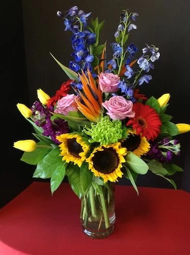 Earth Song comes with sunflowers, purple roses, yellow tulips and blue delphinium to make a perfect and popular flower arrangement.